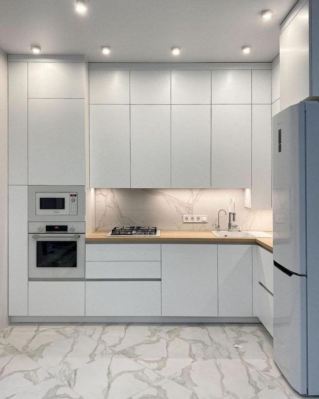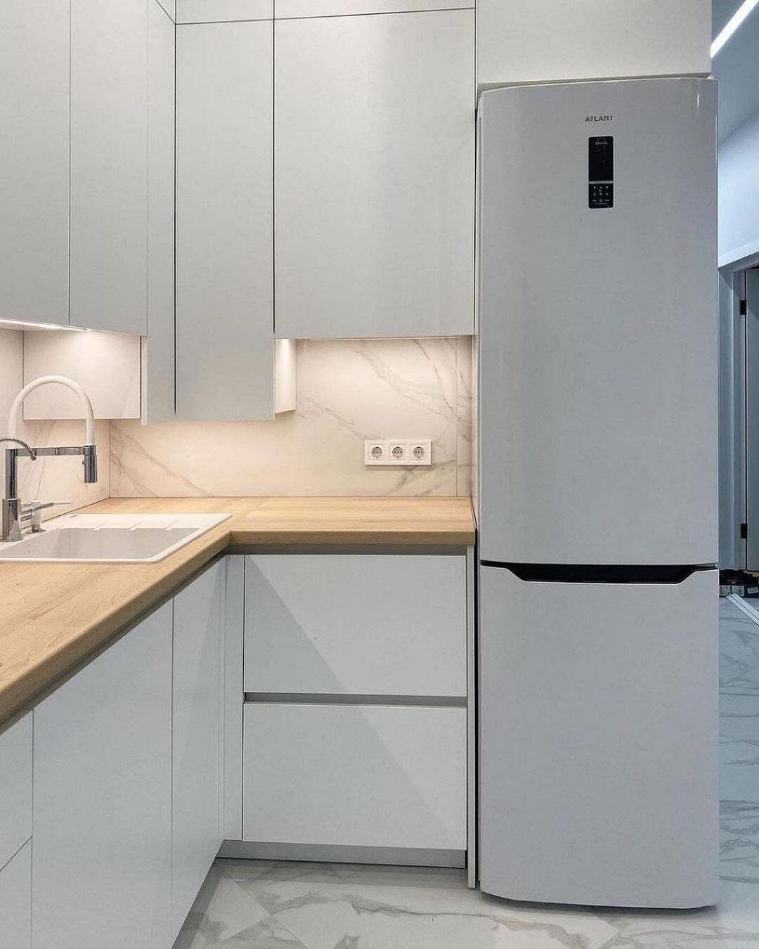 For small kitchens, wall space must be utilizedTherefore, the structure of the kitchen is an L-shaped kitchen customized against the wall.Ceiling cabinet + floor cabinet combination,On one side of the cabinet is a tall cabinet with a steam oven built into it.There is also a refrigerator embedded on the other side.Make full use of wall space for storage.