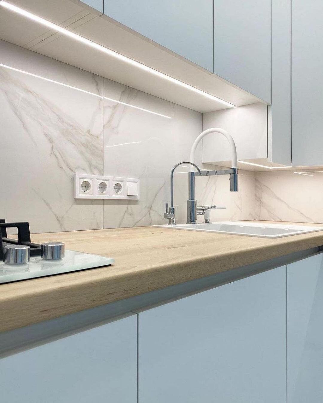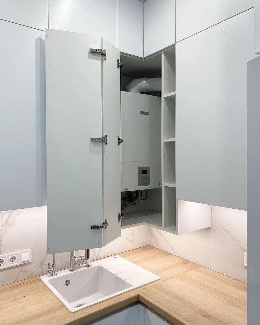 A water heater is also integrated into the corner of the wall cabinet.Make the space more integrated.