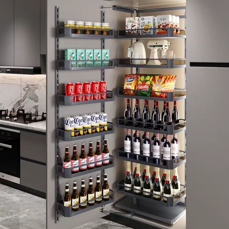 combine hanging shelves in the cabinets with hanging shelves in the doors.